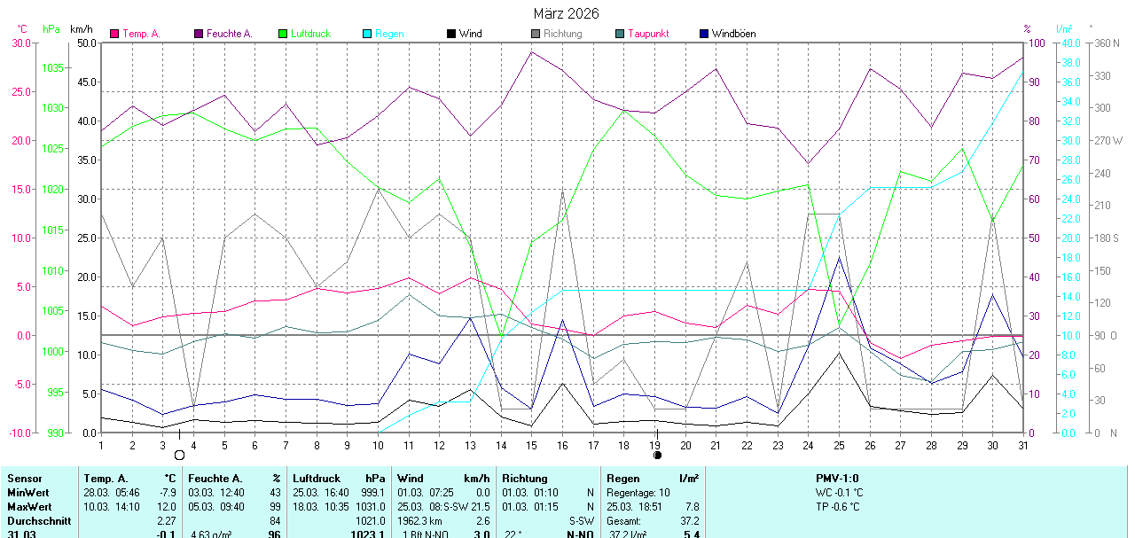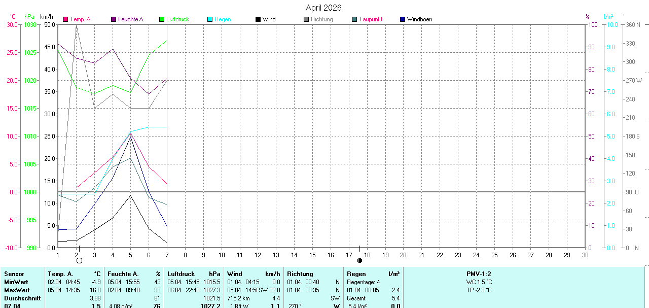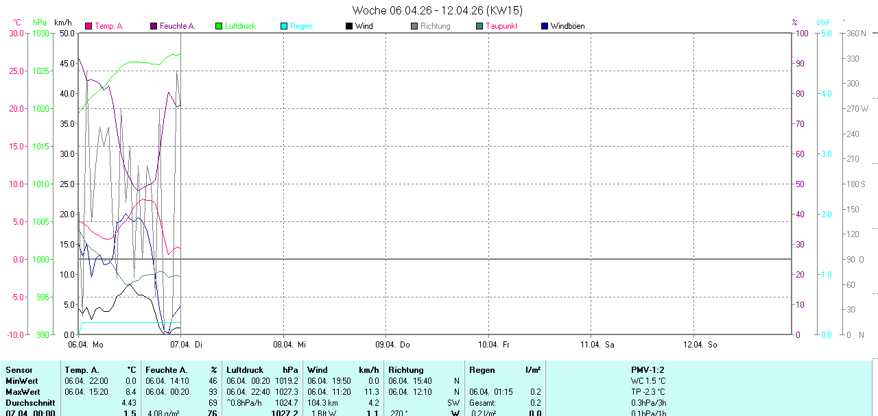 | Die dargestellten Werte repräsentieren die Daten der letzten 24 Stunden! Der Luftdruck ist auf Meereshöhe bezogen! |