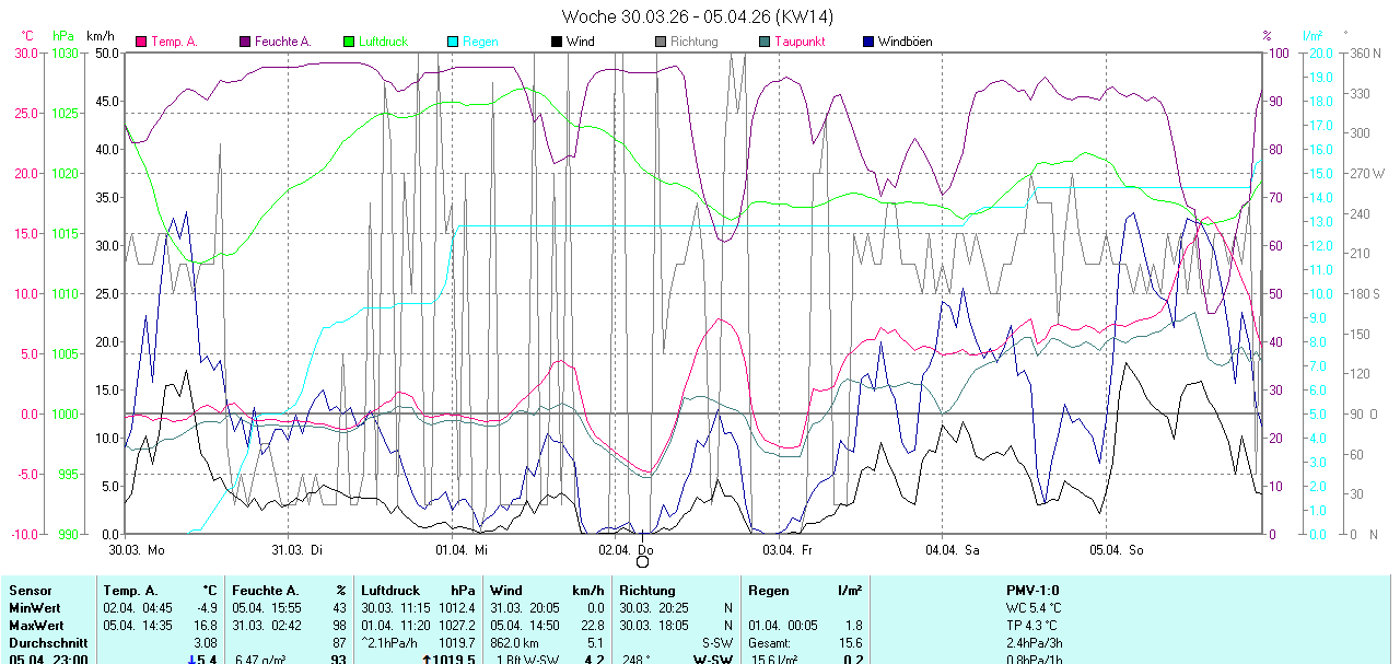 Max.(12:45) W-NW 30,6 km/h (5 Bft) |